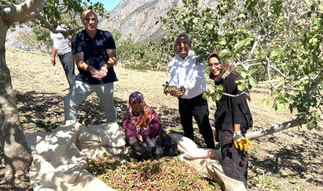 Karaman Ziraat Odası Başkanı Mehmet Bayram, Tarım ve Orman İl Müdürü Yusuf Şahinbaş, Çukur Köyünde Antep Fıstığı hasadı yapan köylüleri ziyaret etti hasata katıldı.