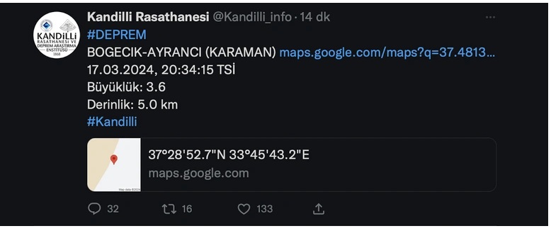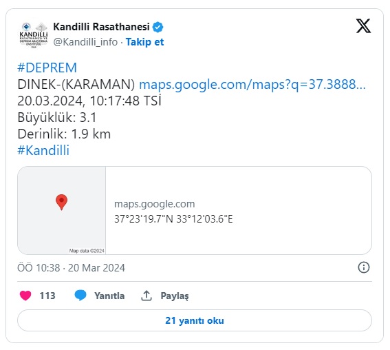 Kandilli rasathanesi 2 gün önce de Karaman’da meydana gelen depremi Ayrancı bölgesinde gerçekleştiğini ve depremin büyüklüğü ise 3.6 olarak tespit edildiğini açıklamıştı.