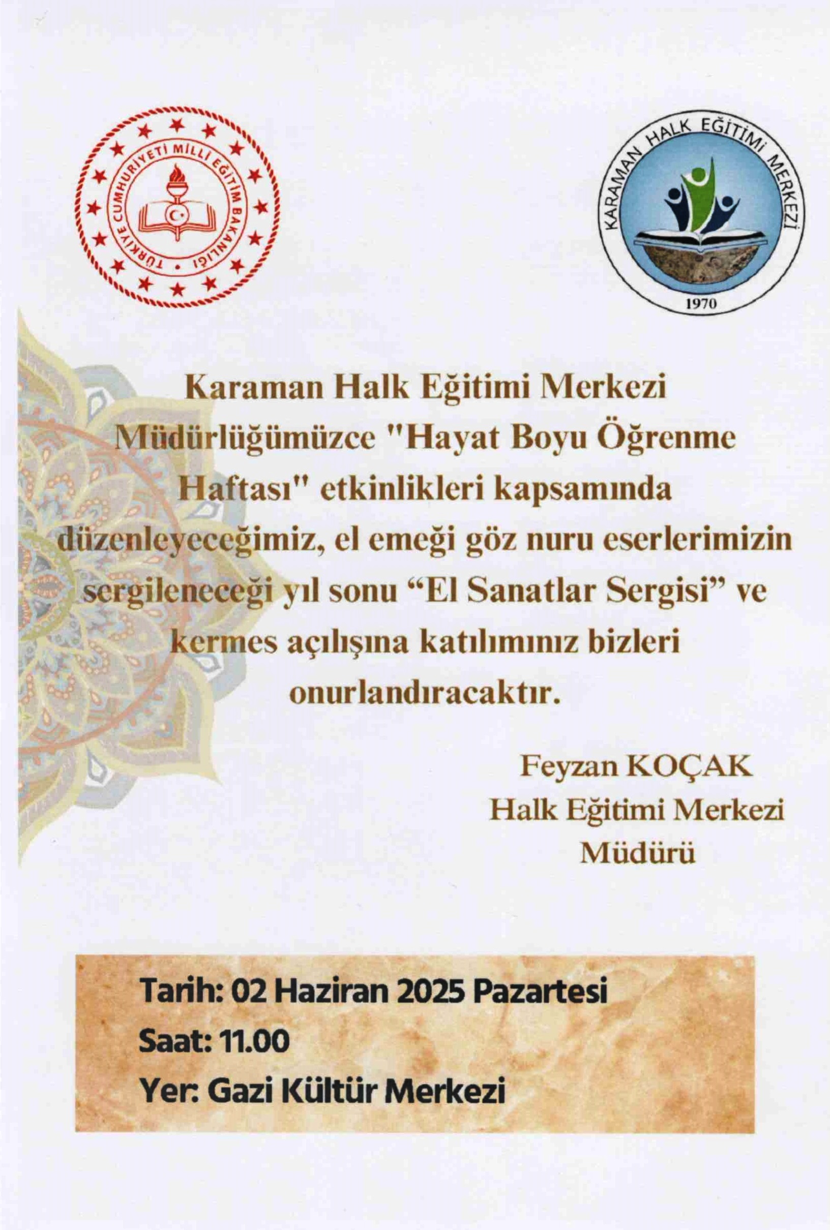 Karaman Halk Eğitimi Merkezi Müdürlüğü, 2-4 Haziran 2025 tarihleri arasında düzenlenecek olan "Hayat Boyu Öğrenme Haftası" etkinlikleriyle Karamanlıları bir araya getirmeye hazırlanıyor. Sergi, konser, halk oyunları ve defile gibi birbirinden renkli etkinliklerle dolu bu özel hafta, Gazi Kültür Merkezi, Aktekke Camii, Aktekke Meydanı ve Millet Bahçesi'nde gerçekleştirilecek.