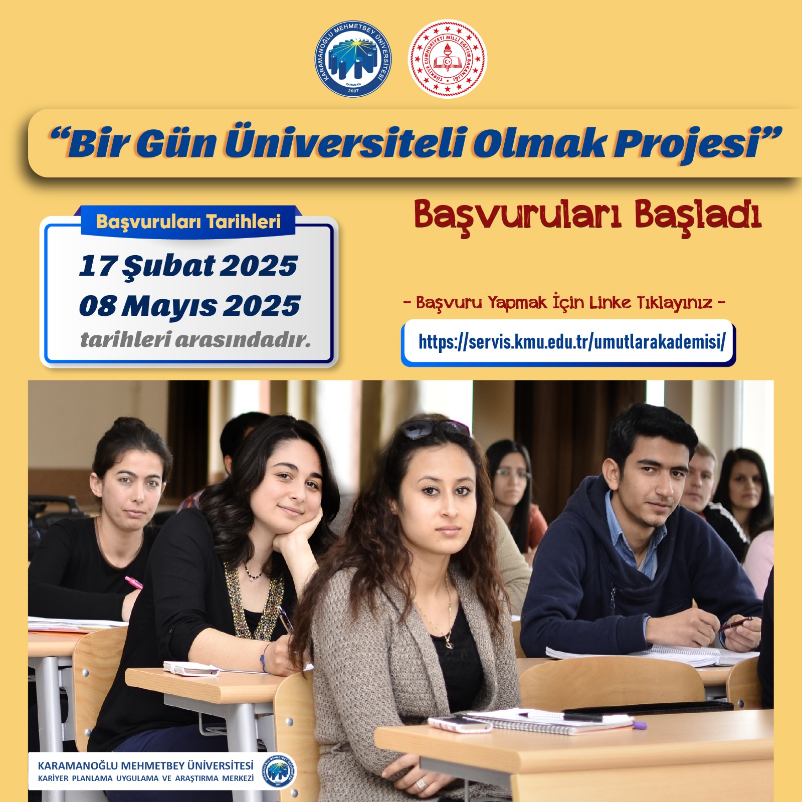 Karamanoğlu Mehmetbey Üniversitesi, lise son sınıf öğrencilerini hedefledikleri bölümlerde buluşturacak “Bir Gün Üniversiteli Olmak Projesi”nin başvuruları başladı.