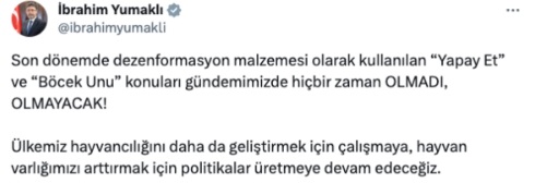 “Yapay et üretimi Bakanlığımızın gündeminde değildir. Ülkemizde bu konuda herhangi bir izin verilmemiştir. Hayvancılığın geliştirilmesi temel önceliğimizdir.”