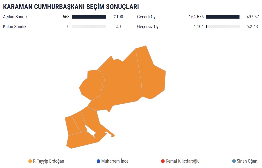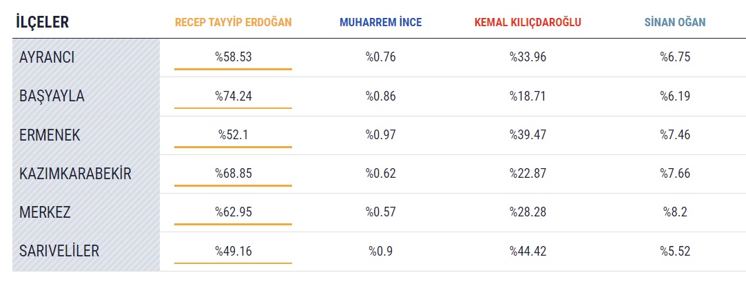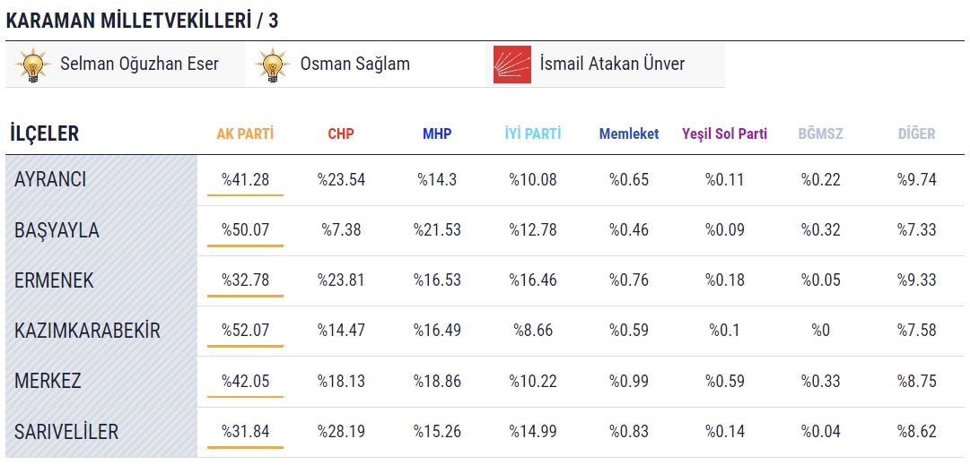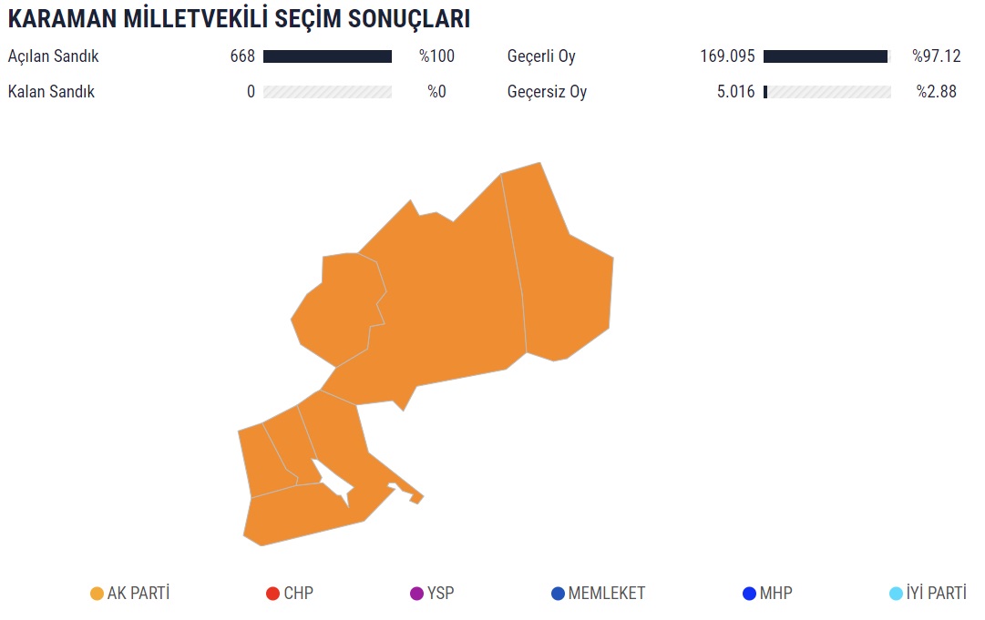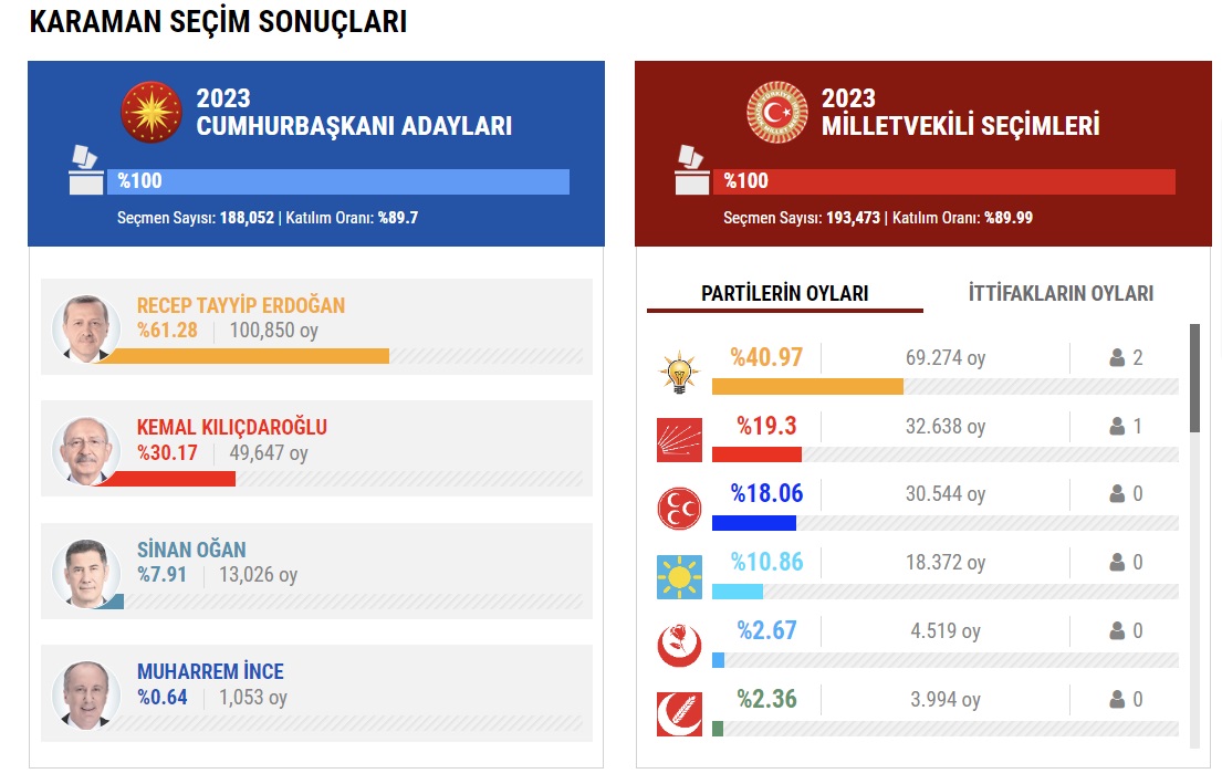 14 Mayıs seçiminin sona ermesinin ardından Karaman’ın ilçelerinde kullanılan oyların kime gittiği de merak konusu oldu. Yüzde 100’ü açılan sandıklardan çıkan kesin sonuçlara göre son durum şöyle: