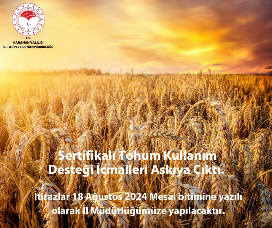 Karaman Tarım ve Orman İl Müdürlüğü, 2024 üretim yılına ait sertifikalı tohum kullanım desteklemesi askı icmallerinin askıya çıkarıldığını duyurdu. Müdürlüğün açıklamasında, “Sertifikalı Tohum Kullanım Desteği Askı icmalleri askıya çıktı. Üreticilerimizin icmalleri Kontrol ederek hata olması durumunda 18 Ağustos mesai bitimine kadar İl Müdürlüğümüze başvuru yapmaları önemle duyurulur.