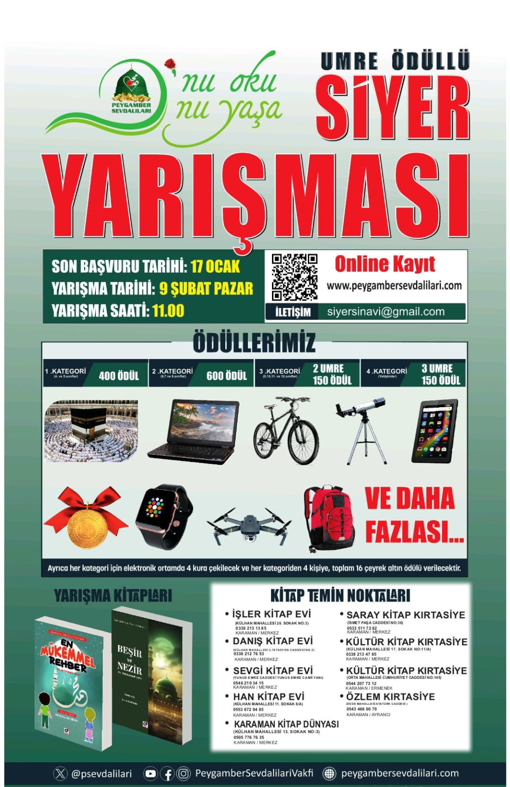 Peygamber Sevdalıları Vakfı Karaman Koordinatörü Mehmet Ali İyibaş, Peygamber Efendimiz Hz. Muhammed’in (Sallallahu Aleyhi Vesselem) hayatını her yaş grubuna aktarmak amacıyla düzenlenen Siyer yarışması için bu yıl katılımcı rekoru hedeflediklerini açıkladı.