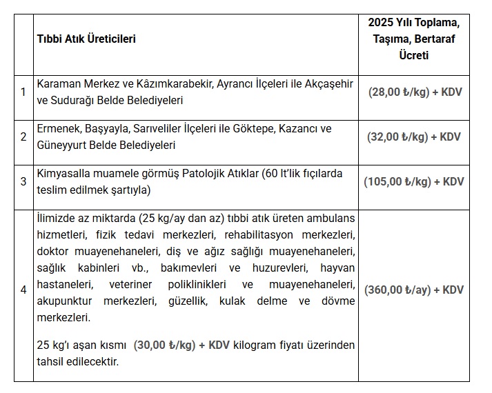2 (İki) madde ve 3 (Üç) sayfadan oluşan Karaman İli Merkezi ve Tüm İlçelerinde 2025 yılında uygulanacak olan “Tıbbi Atık Toplama, Taşıma ve Bertaraf Ücretinin” belirlenmesi ve Belediyeler tarafından ruhsatlandırılan tıbbi atık üreten işletmelerin ruhsatlandırılması aşamasında Tıbbi Atık Toplama, Taşıma, Bertaraf sözleşmesinin istenmesi konulu maddelerin yukarıda belirtildiği şekilde uygulanmasına;
