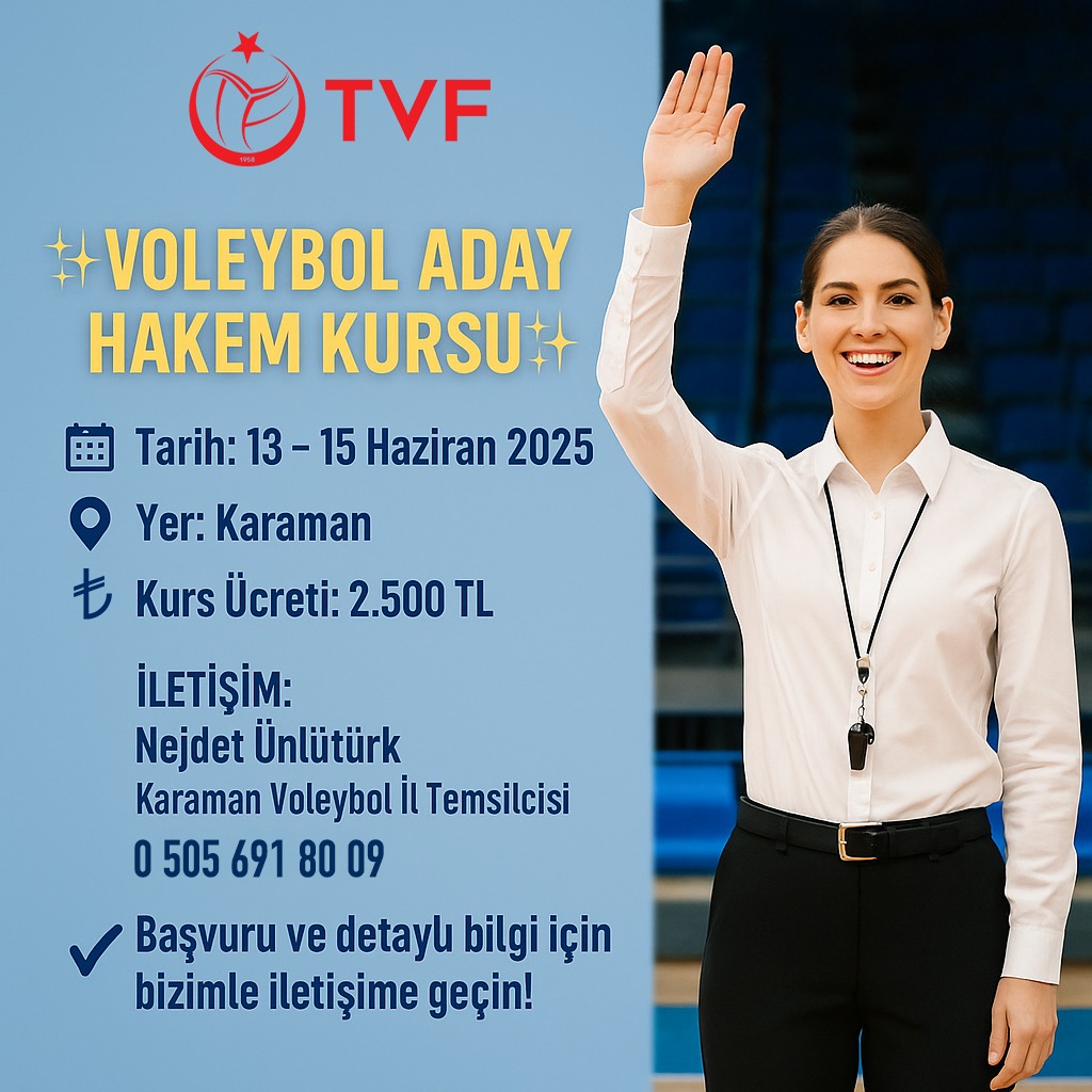 Karaman'da voleybol tutkunları için önemli bir fırsat doğdu! Karaman Gençlik ve Spor İl Müdürlüğü, yeterli sayıya ulaşılması halinde Haziran ayı içerisinde Voleybol Aday Hakem Kursu açmayı planlıyor. Bu kursa katılarak voleybol hakemi olma şansı yakalayabilirsiniz.