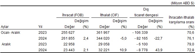 Ocak-Aralık döneminde dış ticaret açığı %22,7 azalarak 106 milyar 339 milyon dolardan, 82 milyar 165 milyon dolara geriledi. İhracatın ithalatı karşılama oranı 2023 Ocak-Aralık döneminde %70,6 iken, 2024 yılının aynı döneminde %76,1'e yükseldi.