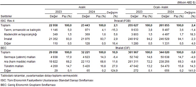 Türkiye İstatistik Kurumu ile Ticaret Bakanlığı iş birliğiyle genel ticaret sistemi kapsamında üretilen geçici dış ticaret verilerine göre; ihracat 2024 yılı Aralık ayında, bir önceki yılın aynı ayına göre %2,1 artarak 23 milyar 443 milyon dolar, ithalat %10,9 artarak 32 milyar 221 milyon dolar olarak gerçekleşti.
