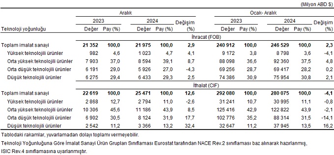 Teknoloji yoğunluğuna göre imalat sanayi ürünleri dış ticareti, Aralık 2024