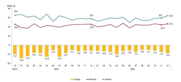 Aralık ayında dış ticaret açığı bir önceki yılın aynı ayına göre %43,9 artarak 6 milyar 100 milyon dolardan, 8 milyar 778 milyon dolara yükseldi. İhracatın ithalatı karşılama oranı 2023 Aralık ayında %79,0 iken, 2024 Aralık ayında %72,8'e geriledi.
