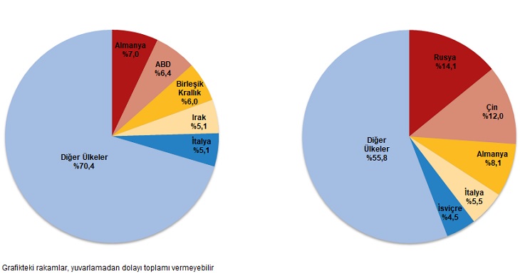 Ocak-Aralık döneminde ihracatta ilk sırayı Almanya aldı. Almanya'ya yapılan ihracat 20 milyar 434 milyon dolar olurken, bu ülkeyi sırasıyla; 16 milyar 349 milyon dolar ile ABD, 15 milyar 289 milyon dolar ile Birleşik Krallık, 13 milyar 34 milyon dolar ile Irak ve 12 milyar 933 milyon dolar ile İtalya takip etti. İlk 5 ülkeye yapılan ihracat, toplam ihracatın %29,8'ini oluşturdu.