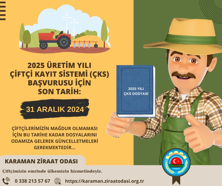 Karaman Ziraat Odası, çiftçilere yönelik önemli bir duyuruda bulundu. 2025 Üretim Yılı Çiftçi Kayıt Sistemi (ÇKS) başvuruları için son tarih 31 Aralık 2024 olarak açıklandı.