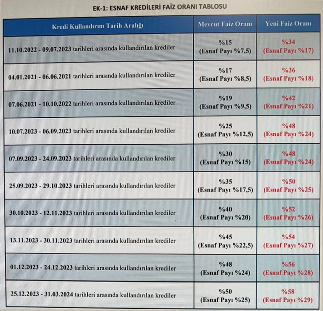 Karaman Esnaf ve Sanatkarlar Odası Başkanı Selahaddin Pekoğlu konuya ilişkin yaptığı açıklamada, “Esnaf Sanatkarlar Kredi ve Kefalet Kooperatiflerimiz aracılığıyla Halkbank tarafından Esnaf ve Sanatkarlarımıza kullandırılmış olan hazine destekli kredilerin devam eden taksit ödemeleri maalesef Halkbank Genel Müdürlüğünce faiz güncelleme uygulamasıyla kademeli olarak 10-15 puan artırılmıştır. Kullandırılan krediler her ne kadar değişken faizli kredi olarak verilmiş olsa da bu uygulama Esnafımızın üstüne ağır bir yük getirecektir” dedi.
