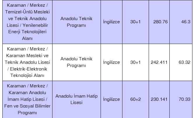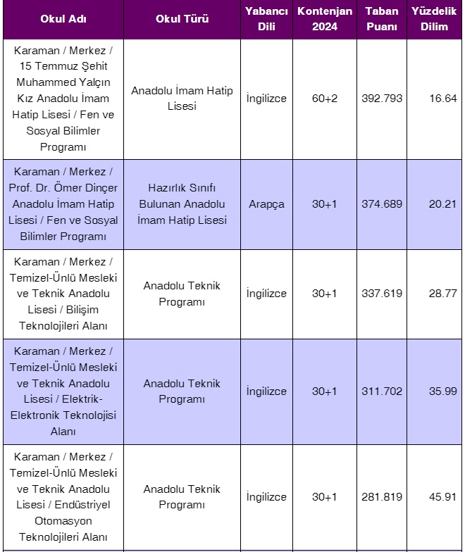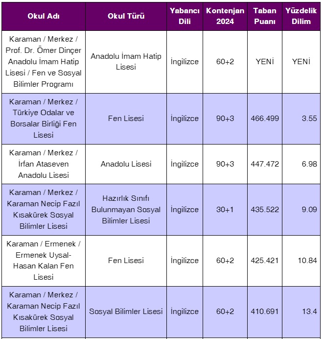28 Haziran 2024 tarihinde ilan edilen merkezi sınav ile öğrenci alan Karaman’daki orta öğretim kurumları yerleştirme sonuçlarına göre tercihe son yerleşen öğrenci sıralaması yayınlandı. Son yerleşen öğrencinin puanı yüzdelik dilimler ve taban puanları MEB' den alınmıştır. Kontenjan bilgisi 2024'e aittir. Deprem kontenjanı + ile ifade edilmiştir.