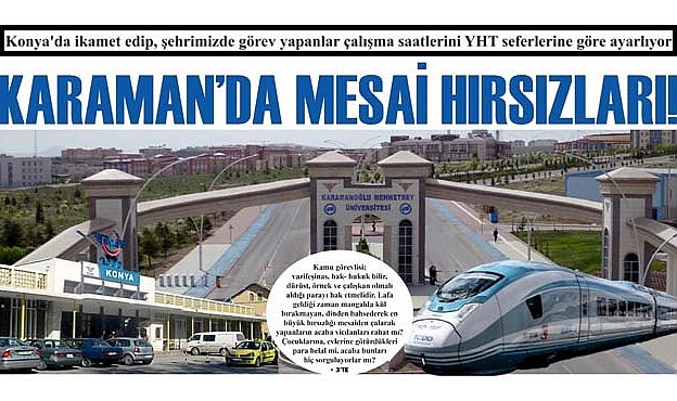 Kamu görevlisi günde 8 saat çalışma zorunluluğu olduğunu bilmesine rağmen yönetim boşluğundan yararlanarak mesaiye uymamaktadır. Konya’dan trenle 10.00 civarında Karaman’da olan, makamı ne olursa olsun bu hırsızlar, trenin Konya’ya dönüş saatine yetişmek adına, görev yerini saat 15.30 gibi terk ediyor ve yine makam aracı, şoförü ile garın yolunu tutuyor.