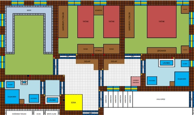 - Yatak odalarında kullanılacak yüklük ve diğer dolaplar (Bu parçalar da horasan harcıyla imal edilip parlatılarak olası deprem riskine karşı odalara sabitlenebilir.)