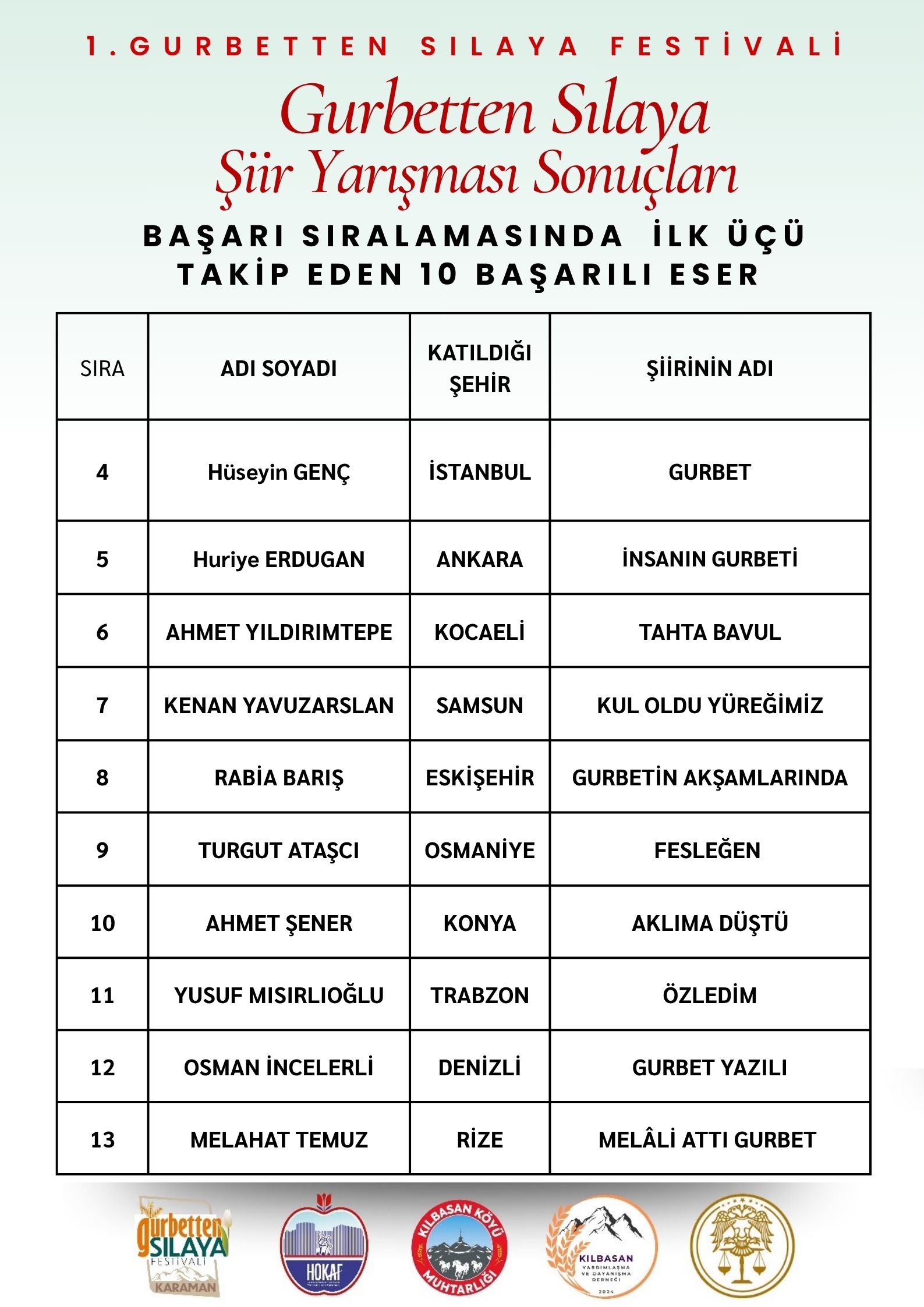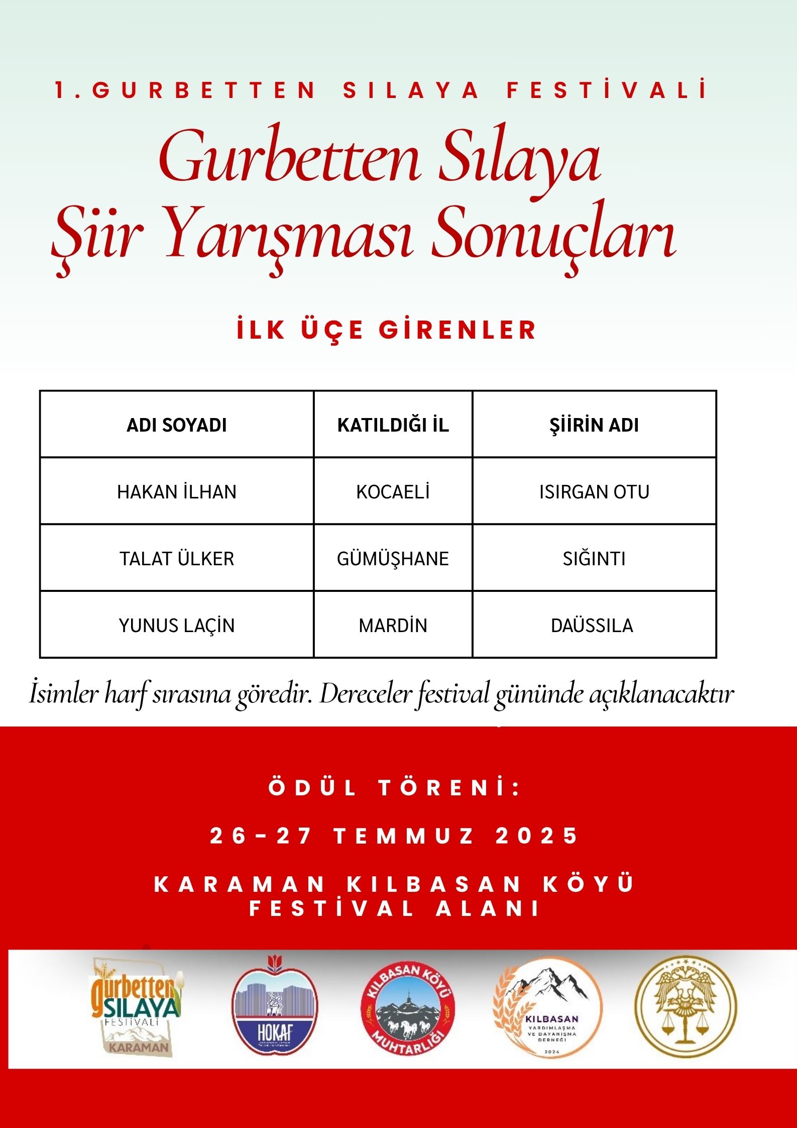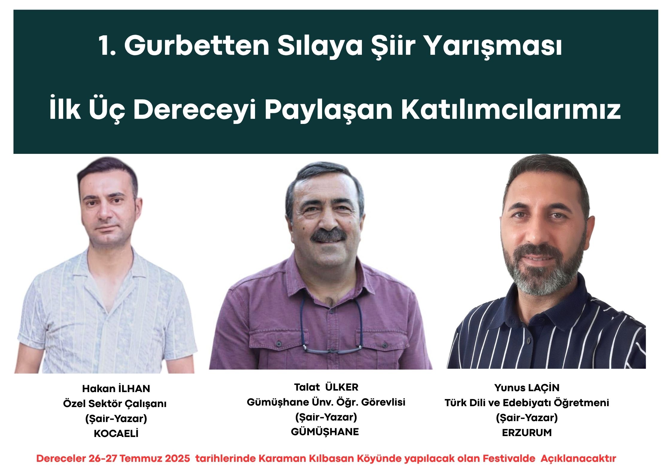 Karaman, gurbet temasını işleyen ve Türkiye'nin dört bir yanından ile uluslararası alandan yoğun ilgi gören 1. **"Gurbetten Sılaya Şiir Yarışması"**nın sonuçlarını açıkladı. Hollanda Karamanlılar Federasyonu, Kılbasan Köyü Muhtarlığı ve Kılbasan Yardımlaşma ve Dayanışma Derneği'nin ortaklaşa düzenlediği yarışmaya 58 şehirden 230 başvuru kabul edildi. Yarışma, Danimarka, Yunanistan, İngiltere, Hollanda ve Özbekistan'dan gelen başvurularla uluslararası bir boyut kazandı.
