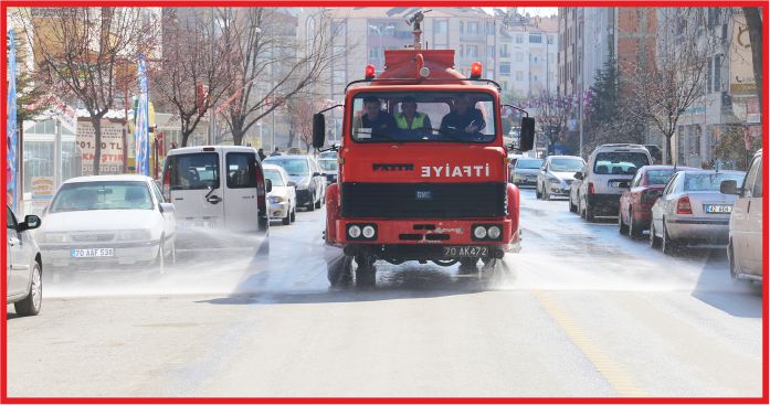 Tüm dünyayı ve ülkemizi tehdit eden koronavirüs (COVID-19) salgınına karşı tedbiri elden bırakmayan Karaman Belediyesi ana arterler başta olmak üzere tüm cadde ve kaldırımları baştan sona sabunla temizliyor, itfaiye aracı ile de tüm yolları yıkıyor. Yine şehir her bölgesini dezenfekte aracı ile temizleyerek tüm tedbirleri almaya devam ediyor.