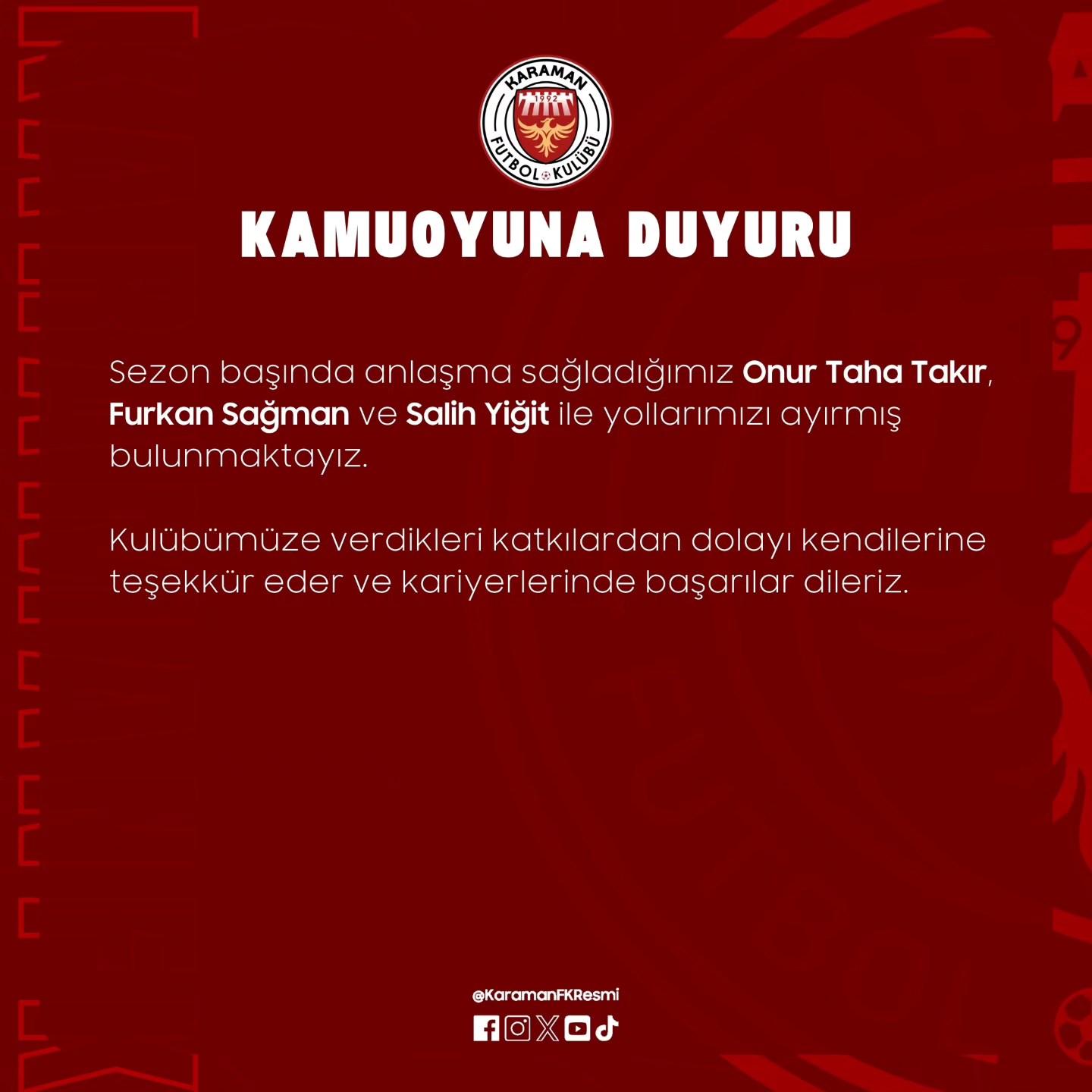 Karaman FK'dan yapılan açıklamada, "Sezon başında anlaşma sağladığımız Onur Taha Takır, Furkan Sağman ve Salih Yiğit ile yollarımızı ayırmış bulunmaktayız. Kulübümüze verdikleri katkılardan dolayı kendilerine teşekkür eder ve kariyerlerinde başarılar dileriz." denildi.