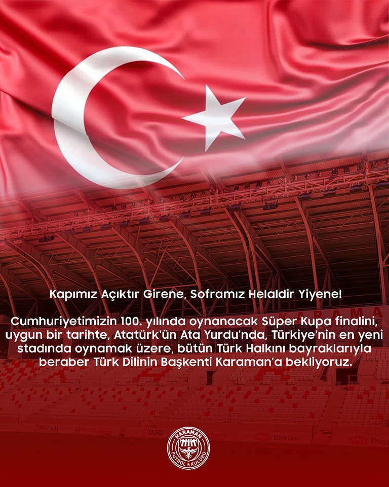 Cumhuriyetimizin 100. yılında oynanacak Süper Kupa finalini, uygun bir tarihte, Atatürk'ün Ata Yurdu'nda, Türkiye'nin en yeni stadında oynamak üzere, bütün Türk Halkını bayraklarıyla beraber Türk Dilinin Başkenti Karaman'a bekliyoruz” ifadelerine yer verildi.