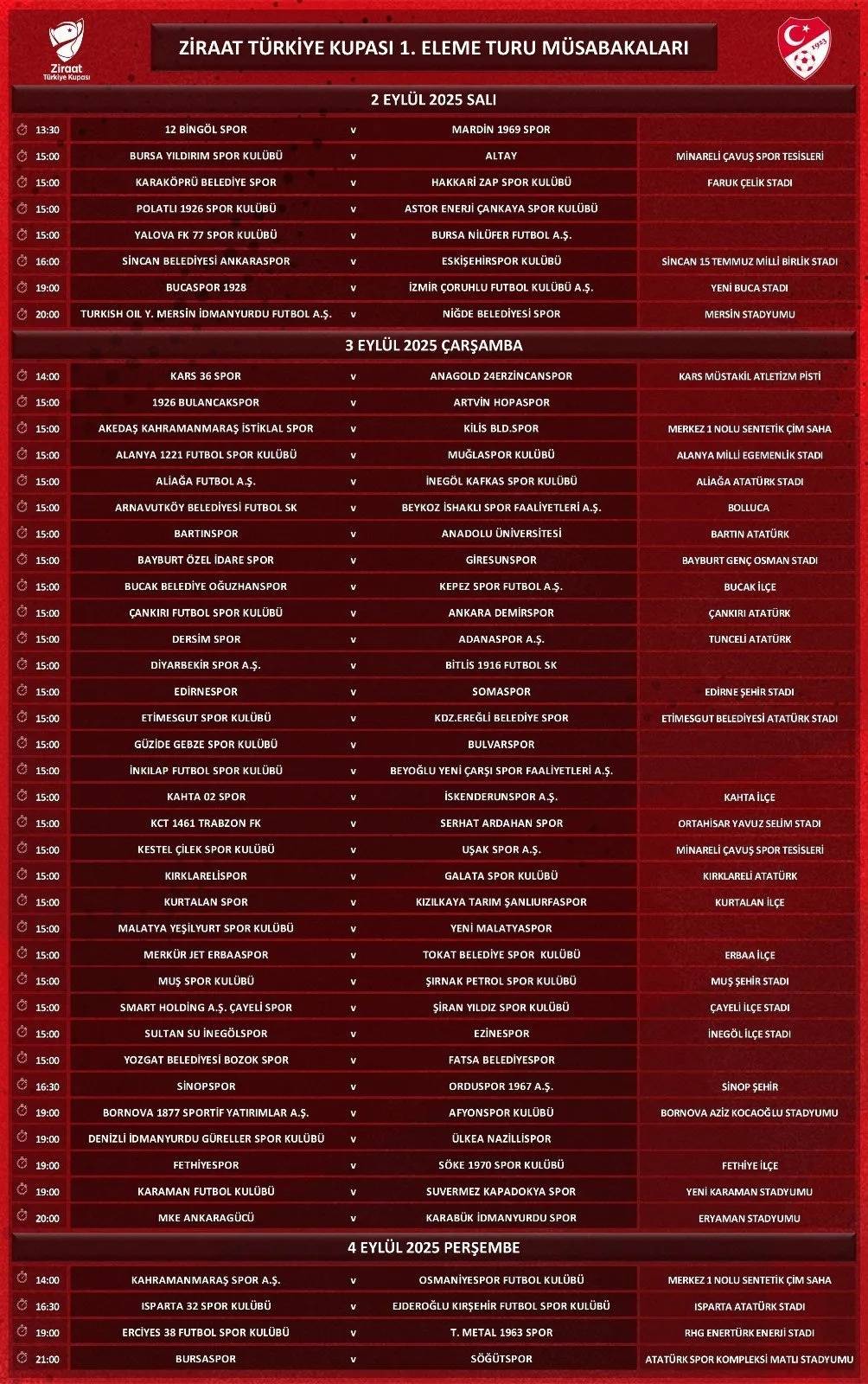Türkiye Futbol Federasyonu (TFF), Ziraat Türkiye Kupası 2025-2026 sezonu 1. Eleme Turu maç programını duyurdu. Maçlar 2 Eylül’de başlayacak.