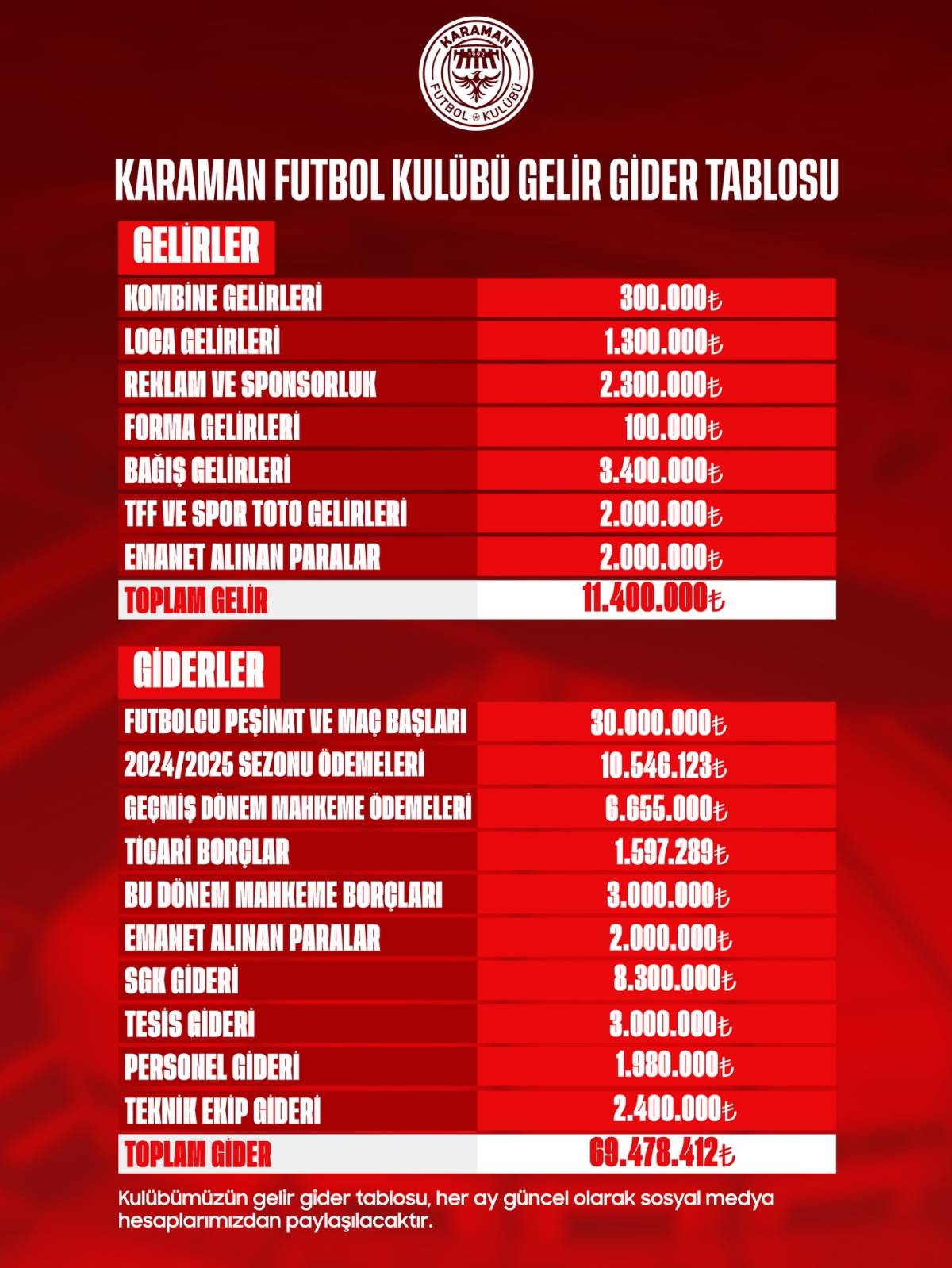Karaman’ı 2. Lig’de temsil eden Karaman Futbol Kulübü, mali durumuna ilişkin kapsamlı gelir-gider tablosunu kamuoyuyla açıkladı. Ortaya çıkan tabloya göre kulübün gelirleri, giderlerin yarısını bile karşılayamıyor. Kulüp yönetimi, mali verilerin her ay düzenli olarak sosyal medya hesaplarından paylaşılacağını duyurdu.