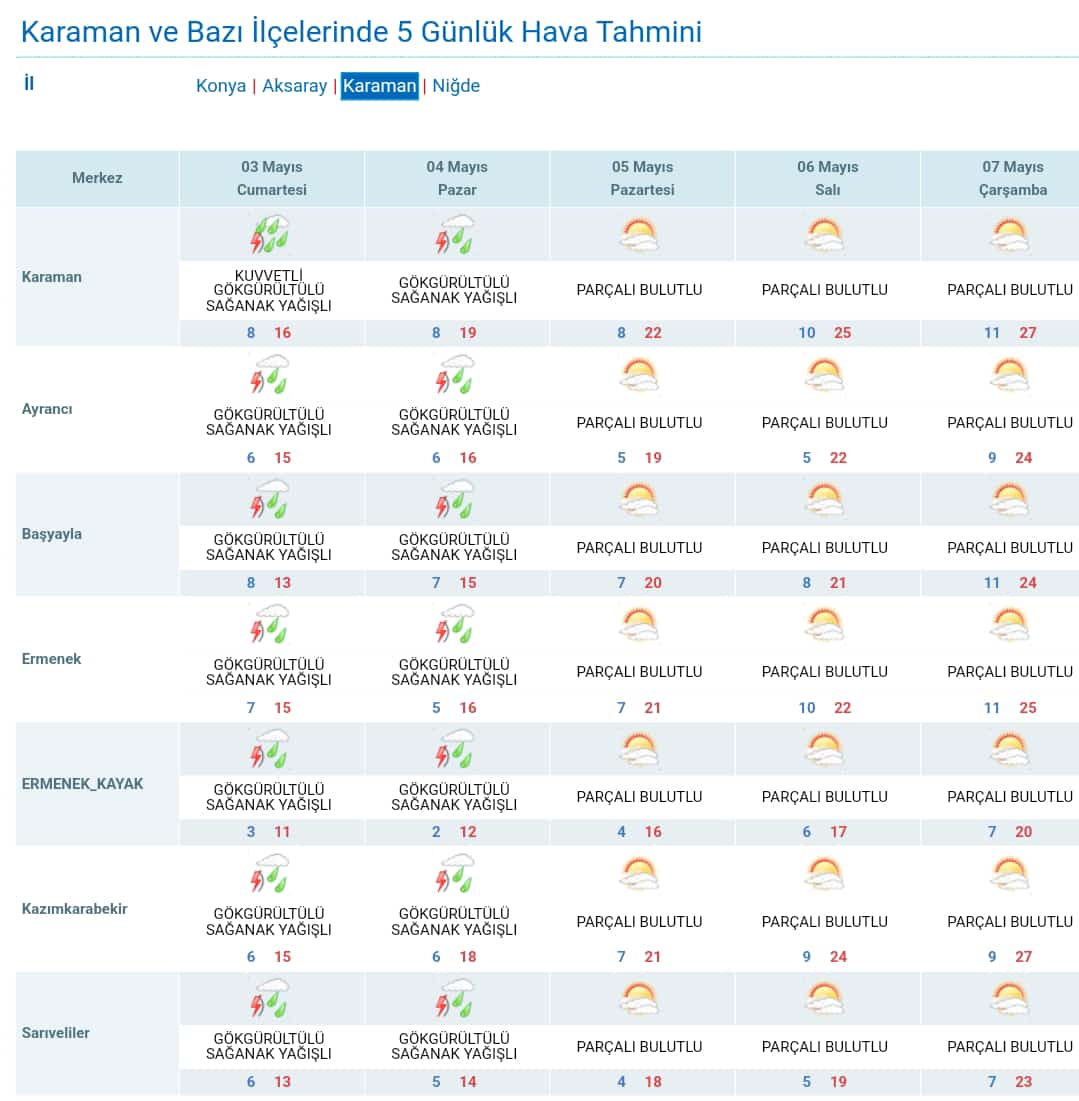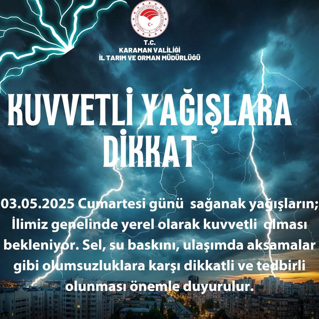 Karaman Valiliği İl Tarım ve Orman Müdürlüğü, 3 Mayıs Cumartesi günü için il genelinde beklenen kuvvetli sağanak yağışlara karşı vatandaşları dikkatli olmaya çağırdı. Yapılan açıklamada, yerel olarak etkili olması beklenen sağanakların sel, su baskını ve ulaşımda aksamalara yol açabileceği vurgulandı.