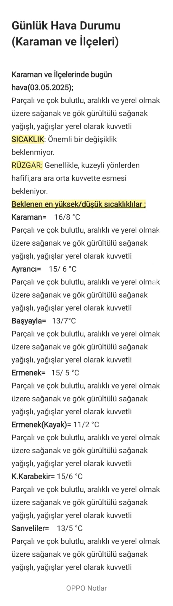 “03.05.2025 Cumartesi günü sağanak yağışların; ilimiz genelinde yerel olarak kuvvetli olması bekleniyor. Sel, su baskını, ulaşımda aksamalar gibi olumsuzluklara karşı dikkatli ve tedbirli olunması önemle duyurulur.”