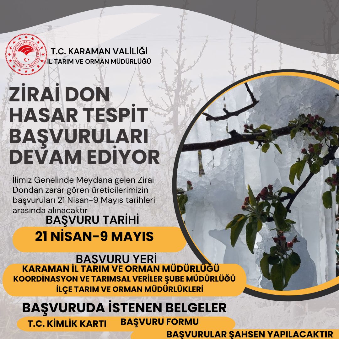 Karaman genelinde etkili olan zirai don olayından zarar gören üreticiler için hasar tespit başvuruları devam ediyor. Karaman İl Tarım ve Orman Müdürlüğü’nden yapılan açıklamada, başvuru süresinin 21 Nisan – 9 Mayıs 2025 tarihleri arasında olduğu hatırlatıldı.