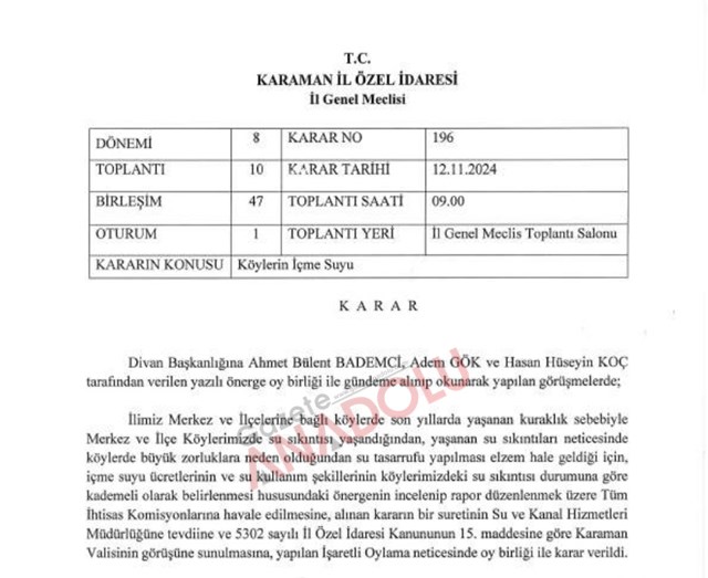 12 Kasım 2024 tarihinde alınan İl Genel Meclisi kararıyla, köylerdeki içme suyu sıkıntısını çözmek için komisyon kurulmasına ve su kullanımında tasarrufu teşvik eden düzenlemeler yapılmasına karar verilmişti. Ancak bu kararda, su kaynaklarının iyileştirilmesine yönelik somut bir bütçe planlaması yapılmamıştı.