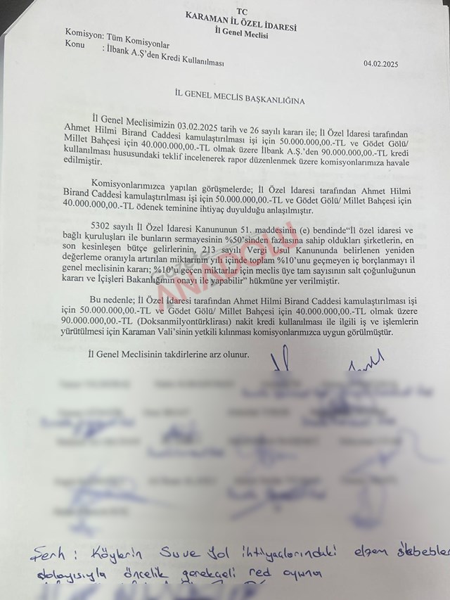 Karaman İl Genel Meclisi, 03 Şubat 2025 tarihinde aldığı kararla, Ahmet Hilmi Birand Caddesi’nin kamulaştırılması için 50 milyon TL, Gödet Gölü/ Millet Bahçesi projesi için ise 40 milyon TL olmak üzere toplamda 90 milyon TL’lik kredi kullanımı için İlbank A.Ş.’den borçlanma teklifi hazırladı.