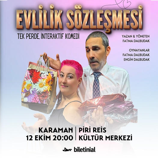 Karaman’da tiyatroseverleri kahkahaya boğacak bir oyun izleyicilerle buluşmaya hazırlanıyor. Fatma Dalbudak’ın yazıp yönettiği ve başrollerini Engin Dalbudak ile paylaştığı “Evlilik Sözleşmesi”, 12 Ekim Cumartesi günü saat 20.00’de Piri Reis Kültür Merkezi’nde sahnelenecek.