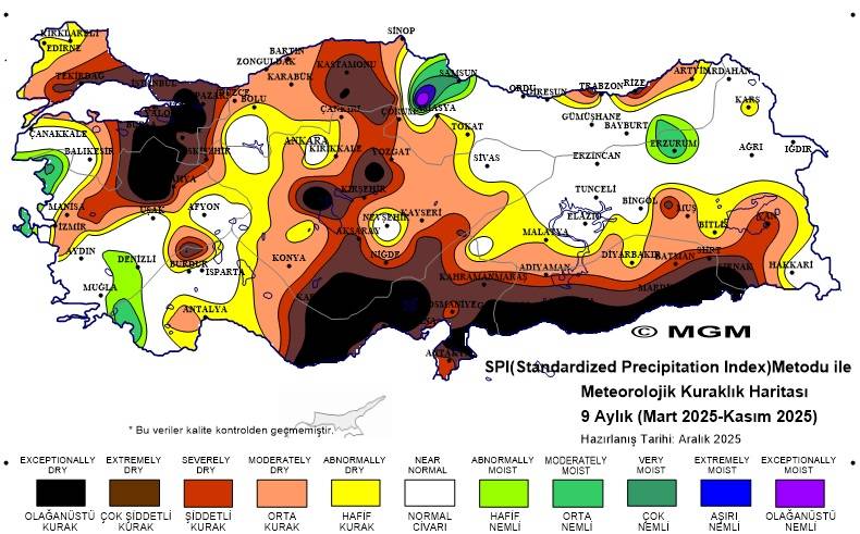 Meteoroloji tarafından paylaşılan 3 aylık verilere göre (Eylül 2025 – Kasım 2025) Karaman, şiddetli ve çok şiddetli kuraklık sınırında yer aldı. 6 aylık (Haziran 2025 – Kasım 2025) haritada ise kent genelinin çok şiddetli kuraklık kategorisinde olduğu görüldü.