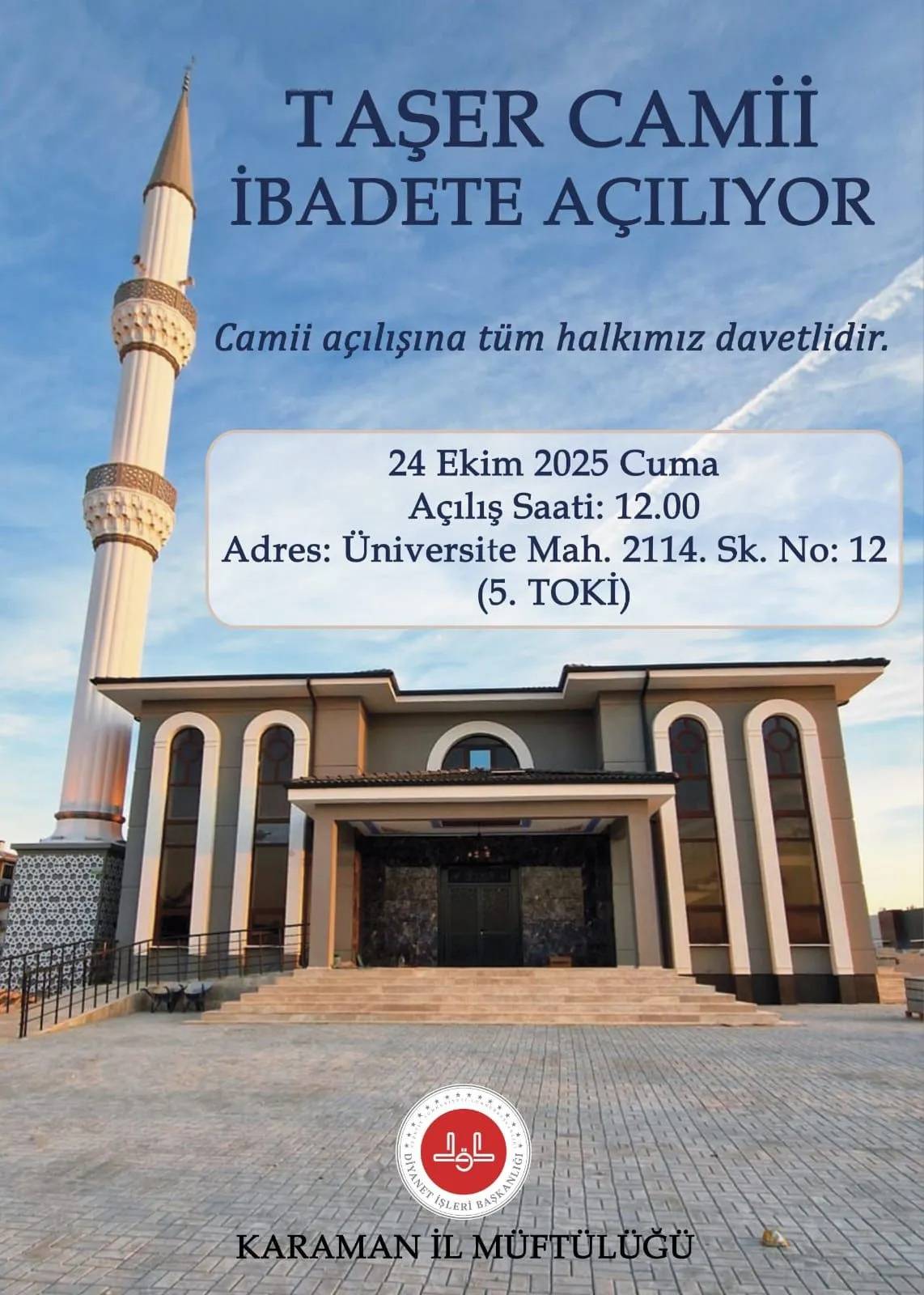 Karaman’da Üniversite Mahallesi’nde yapımı tamamlanan Taşer Camii, 24 Ekim Cuma günü düzenlenecek törenle ibadete açılacak.