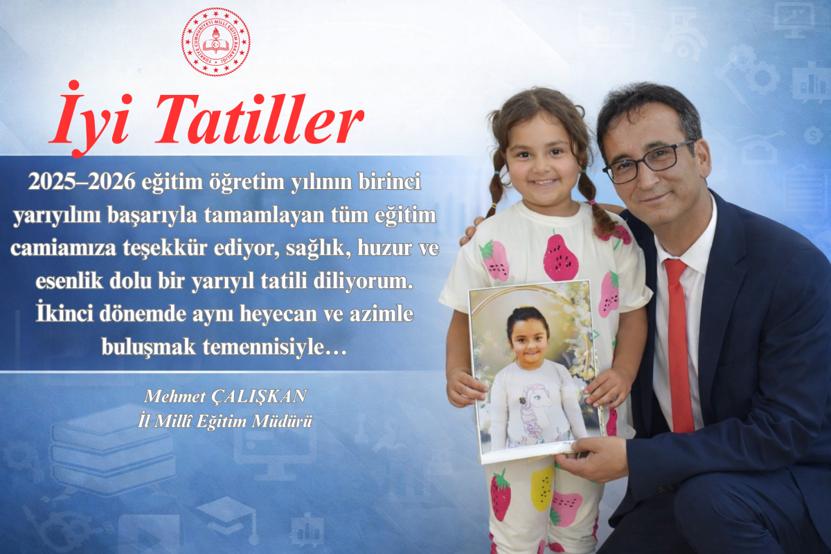 Bu duygu ve düşüncelerle; 2025–2026 eğitim öğretim yılının birinci yarıyılını başarıyla tamamlayan tüm eğitim camiamıza teşekkür ediyor, sağlık, huzur ve esenlik dolu bir yarıyıl tatili diliyorum. İkinci dönemde aynı heyecan ve azimle buluşmak temennisiyle…”dedi.