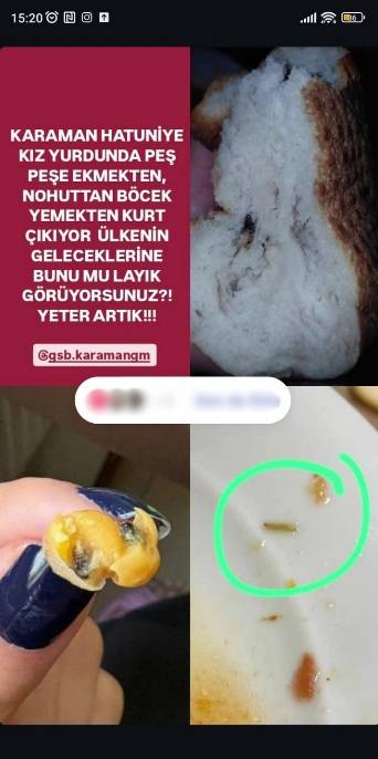 İddialara göre yurtta öğrencilere verilen yemeklerde hijyen sorunu yaşandığı öne sürüldü. Bazı öğrencilerin sosyal medya hesaplarından yaptığı paylaşımlarda, ekmek ve nohut yemeklerinde böcek, diğer yemeklerde ise kurt görüldüğü iddia edildi. Öğrencilerin bu paylaşımları anket şeklinde yayarak birbirlerini etiketlemesi, konunun daha geniş kitlelere ulaşmasına neden oldu.