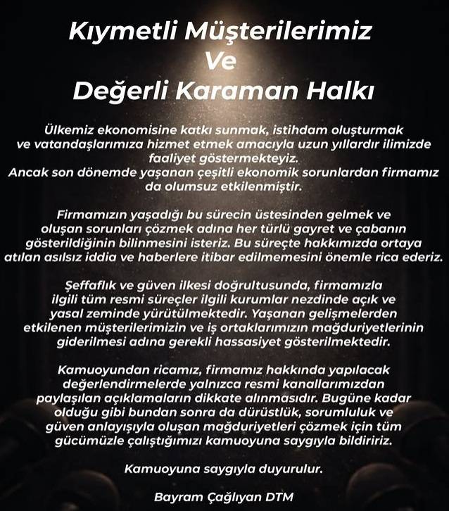 Kent merkezinde faaliyet gösteren işletmenin kepenk kapatmasının ardından çok sayıda vatandaşın mağdur olduğu ve zararın yaklaşık 300 milyon TL olduğu yönündeki iddialar gündemdeki yerini korurken, firma tarafından yapılan açıklamada işletmenin uzun yıllardır Karaman’da hizmet verdiği vurgulandı. Açıklamada, firmanın bugüne kadar istihdam sağladığı ve ülke ekonomisine katkı sunduğu ifade edildi.