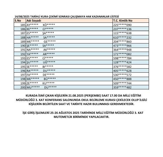 Kura sonucu görevlendirilmeye hak kazananların eğitim kurumlarına dağılımı ise 21 Ağustos 2025 Perşembe günü saat 17.00'de Karaman İl Millî Eğitim Müdürlüğü Konferans Salonu'nda gerçekleştirilecek. Bu aşama sonrasında, görevlendirilecek kişiler belirlenen okullarda çalışma hayatına başlayacak.