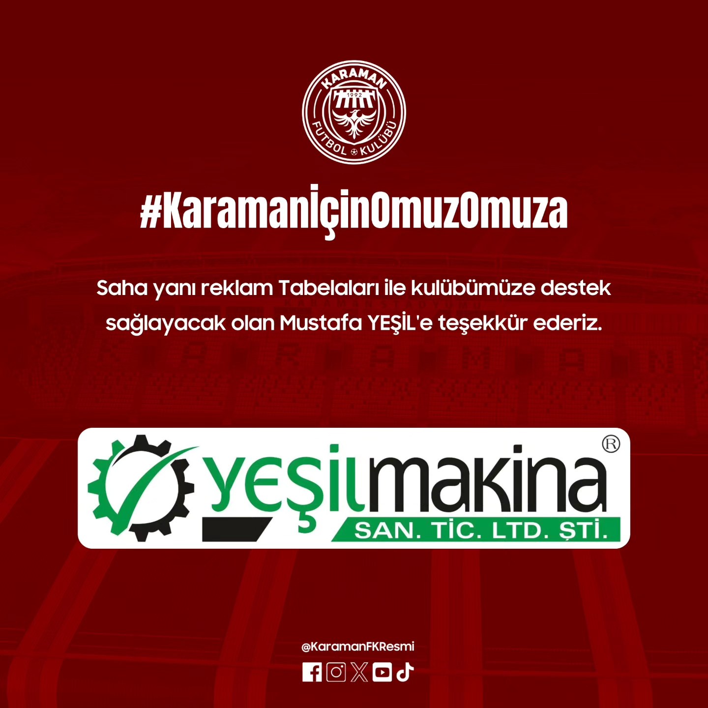 Yeniden Refah Partisi Karaman İl Başkanı ve Karaman’daki Yeşilmakina şirketinin sahibi Mustafa Yeşil de Karaman FK’ya 50 bin lira değerindeki saha yanı reklam tabelası aldı. Külüpten yapılan açıklamada, “Saha yanı reklam tabelaları ile kulübümüze destek sağlayacak olan Mustafa Yeşil'e teşekkür ederiz” denildi.