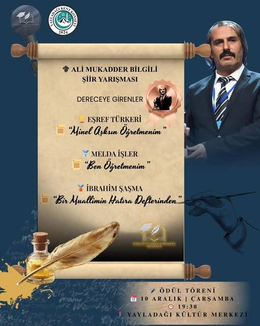 Hatay Yayladağı Belediyesi’nin katkılarıyla, Yayladağı Kent Konseyi ve Yayladağı Okul Yaşatma Derneği tarafından düzenlenen şiir yarışmasında Karamanlı şair İbrahim Şaşma, “Bir Muallimin Hatıra Defterinden” adlı şiiriyle üçüncülük ödülüne layık görüldü.
