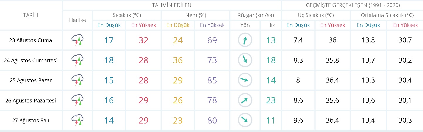 Meteoroloji Genel Müdürlüğü tarafından yapılan son değerlendirmelere göre: Karaman'da önümüzdeki 5 gün sağanak ve gökgürültülü yağış bekleniyor. İlimizdeki yağış ile birlikte hava sıcaklığının da 4-6 derece düşerek 28-29 derece olacağı belirtildi.