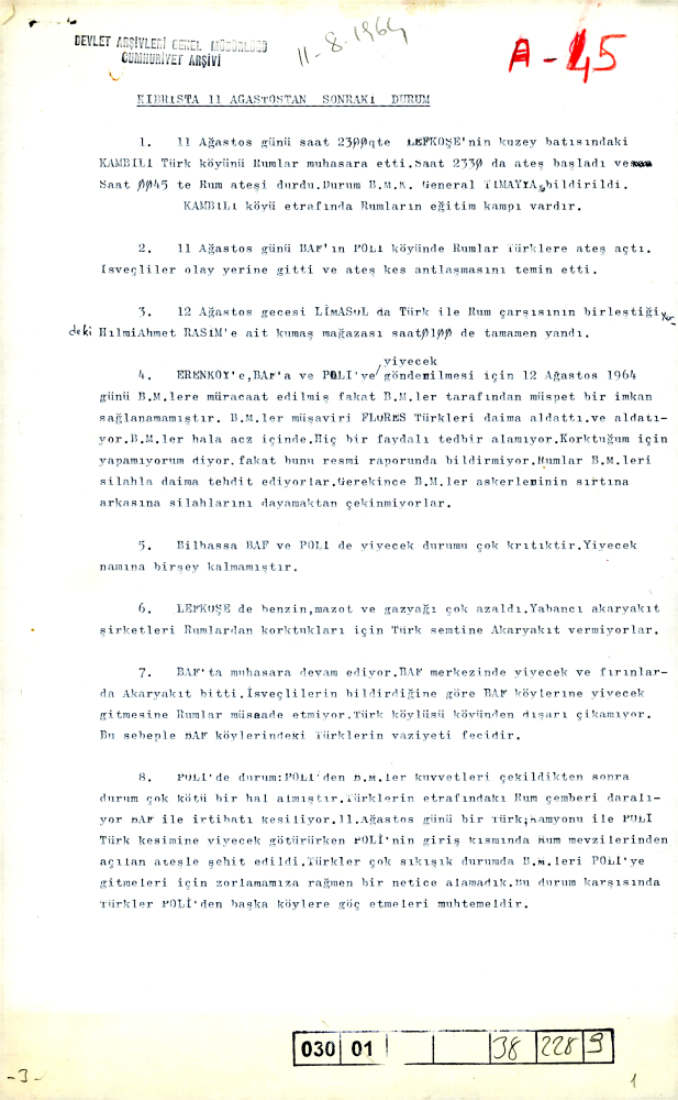Rumların, Kıbrıs Türklerine uyguladığı mezalime ilişkin detaylar, 11 Ağustos 1964'te dönemin başbakanına iletilen bir raporda ayrıntılarıyla aktarılıyor.