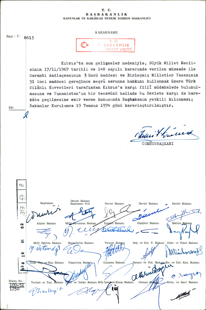 Harekattan bir gün önce, 19 Temmuz 1974'te yayımlanan Cumhurbaşkanı Fahri Korutürk ve Bakanlar Kurulu üyelerinin imzaladığı kararnamede, şu ifadelere yer verildi: