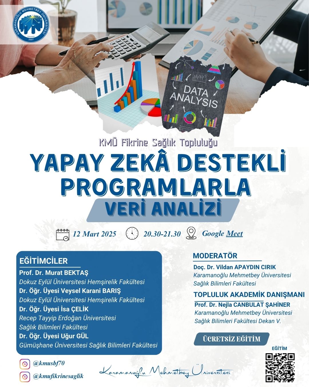 Karamanoğlu Mehmetbey Üniversitesi (KMÜ) Sağlık Bilimleri Fakültesi ve Fikrine Sağlık Topluluğu iş birliğiyle "Yapay Zeka Destekli Programlarla Veri Analizi" konulu çevrimiçi eğitim 12 Mart 2025 Salı günü saat 20.30'da gerçekleştirilecek.