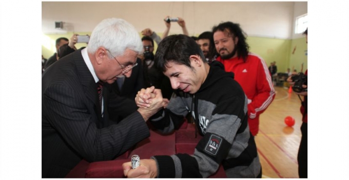 Down Sendromlu öğrencinin İstiklal Marşımızı okumasıyla başlayan şölen, Karaman Valisi Murat Koca’nın zihinsel engelli bir öğrenciyle bilek güreşi yapmasıyla devam etti.