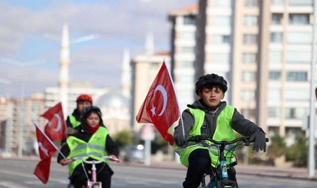 Konya Büyükşehir Belediyesi zabıta birimlerinin ve öğretmenlerin eşlik ettiği sürüş esnasında öğrenciler, bisikletlerinin gidonlarına bağladıkları bayraklarla belirlenen güzergah boyunca pedal çevirdi.