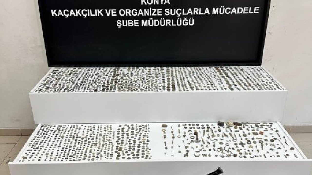 Konya'da düzenlenen tarihi eser kaçakçılığı operasyonunda 1912 sikke ve 196 obje ele geçirildi.