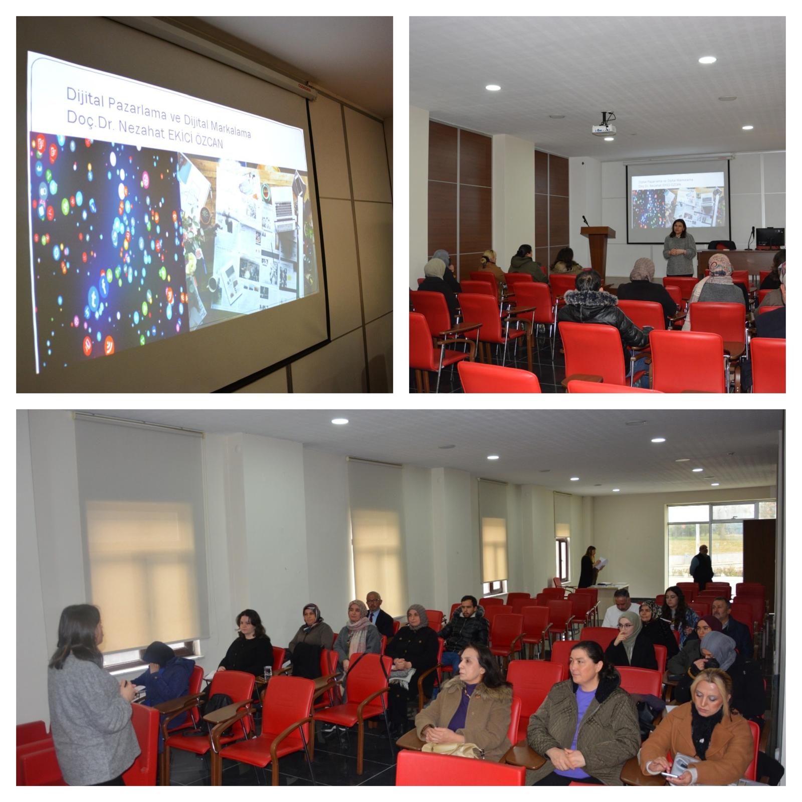 Doç. Dr. Nezahat Ekici Özcan; girişimcilerimize sosyal medyanın etkin kullanımı, dijital pazarlama, kampanya oluşturma gibi konularda sunum yaptı. Katılımcılara konularla ilgili slaytlar gösterilerek; daha başarılı olmak için Dijital ortamların nasıl kullanılması gerektiği konusunda bilgi verildi.