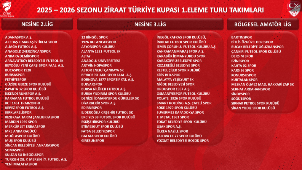 Ziraat Türkiye Kupası 1. Eleme Turu Kura Çekimi, 21 Ağustos 2025 Perşembe günü saat 14.00'te kulüp yetkililerinin katılımı ile Riva'da yapılacak.