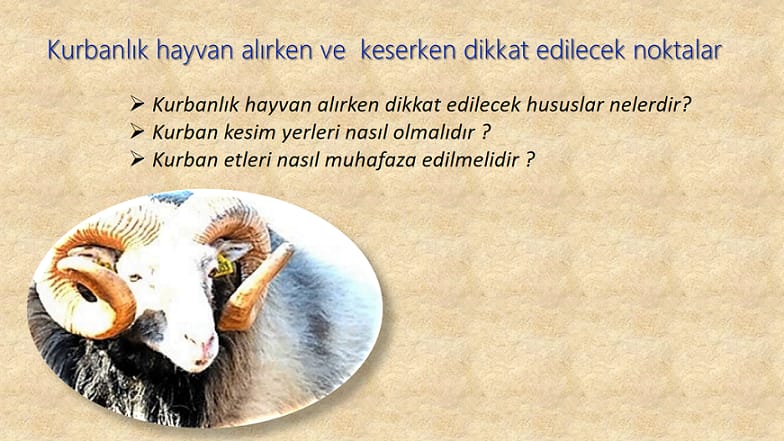 Hasta, zayıf, düşkün, bir veya iki gözü kör, bir veya iki boynuzu kökünden kırık, dili, kuyruğu, kulakları veya memesi kesik, dişlerinin tamamı ya da çoğu dökük hayvanlardan kurban olmayacağını dile getiren ÇAĞLIYAN, hayvanın doğuştan boynuzsuz olması, şaşı, bir kulağı delik veya yırtılmış olmasının kurban edilmesine mani olmadığını söyledi.